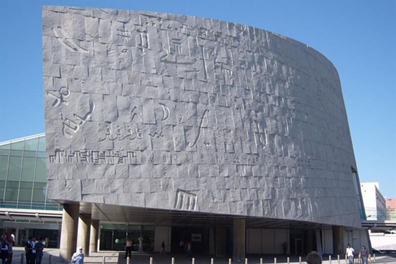 The exterior of the building is decorated with the characters of 120 different written languages as a reference to the wealth of knowledge from around the world once housed in the Great Library.